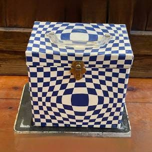 I received my first record player as a birthday gift when I was either seven or eight.  If I  recall correctly it was a red, white and black RCA with a dust cover. I’ve been searching for a picture of one just like it and can’t seem to find one. With it came a blue and white checked carrying box for 45s.  Loved that blue and white box.  Here’s a picture of the exact same box I owned.